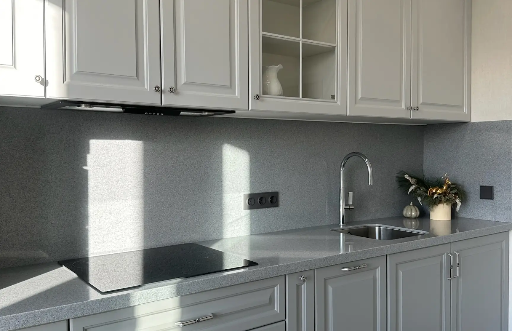 Кухня, выполненная из МДФ с матовой эмалью, представляет собой изысканное сочетание оттенков серого. Основные шкафы, окрашенные в насыщенный серый цвет, создают прочную визуальную основу и придают интерьеру глубину. Верхние шкафы, напротив, выполнены в нежном, светлом оттенке серого, что добавляет композиции легкости и воздушности.