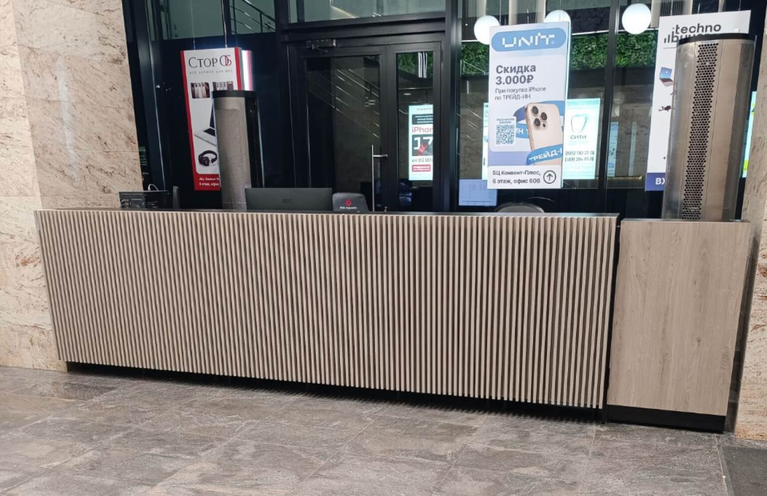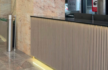 - Коронный номер — столешница ресепшна. Дизайнеры хотели «вау-эффект» и практичность. Их выбор пал на кварцевый агломерат цвета «Тлеющий шнур» (Cordite). Наша задача — безупречно его интегрировать. Получилось огненно!
