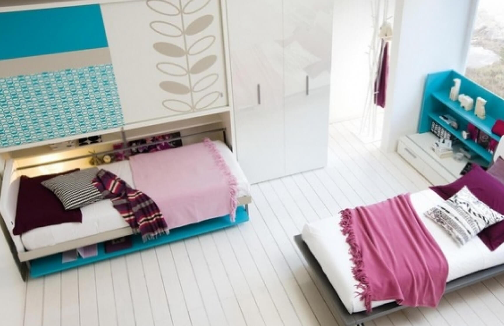 Кровати-чердаки, где спальное место находится наверху, а внизу освобождается пространство для игр или учебы.